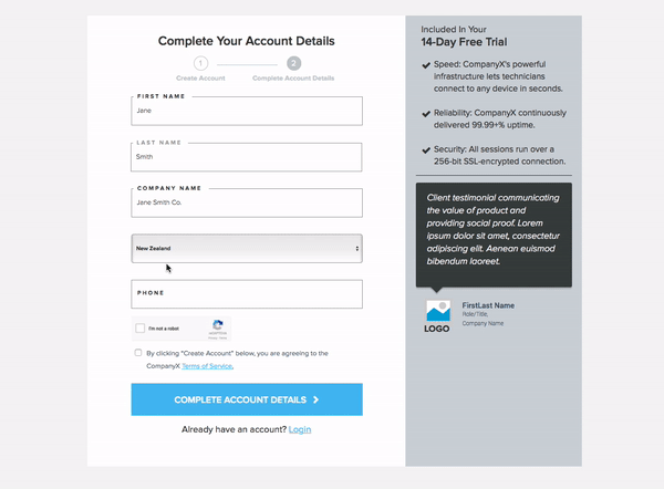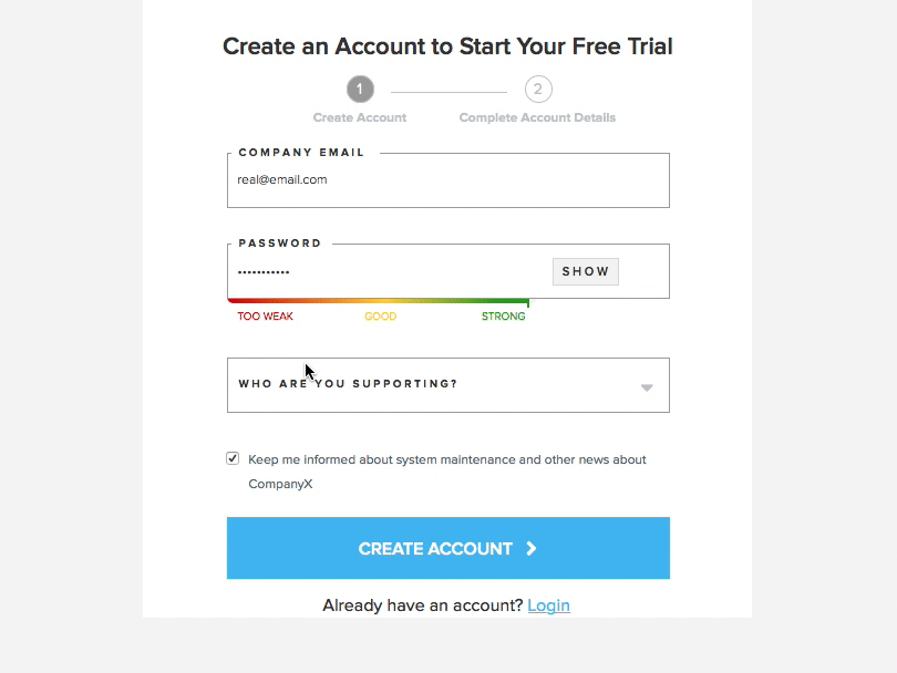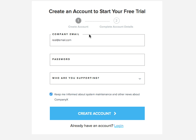 Add hint labels that let users how their information will be used. For example, let users know that their email address will be used to activate and log in to their account. This will help minimize user frustration later in the process and improve the quality of lead by dissuading the use of false email addresses.